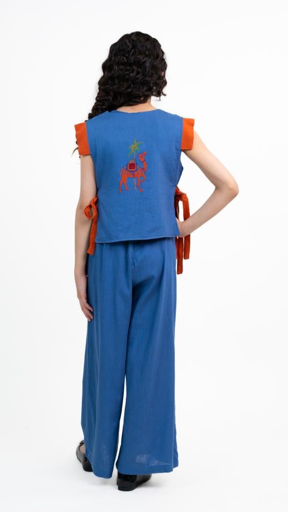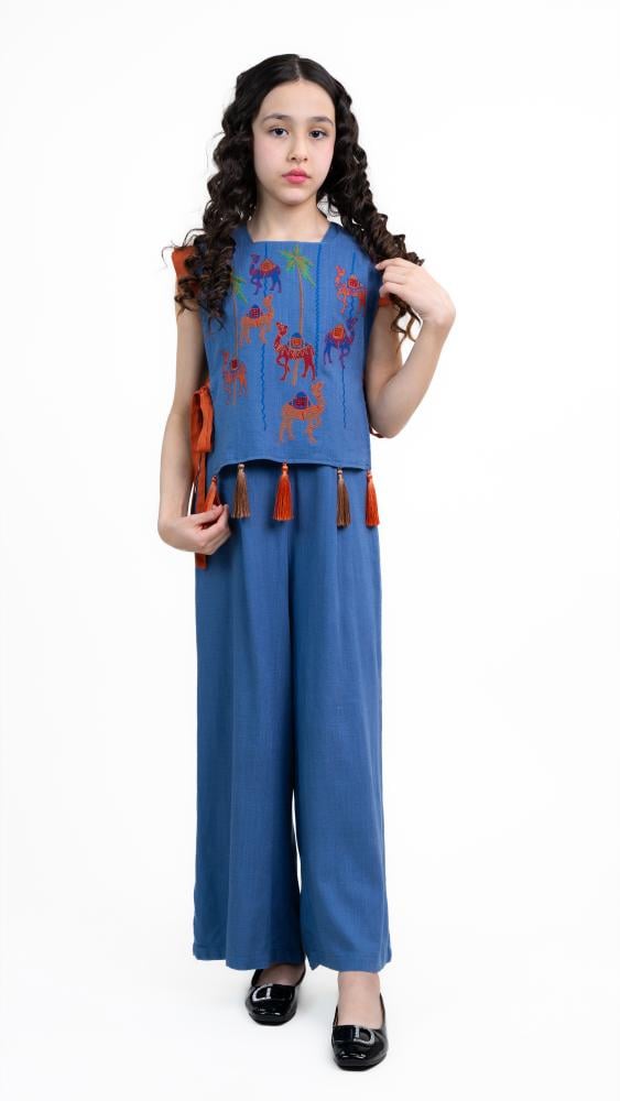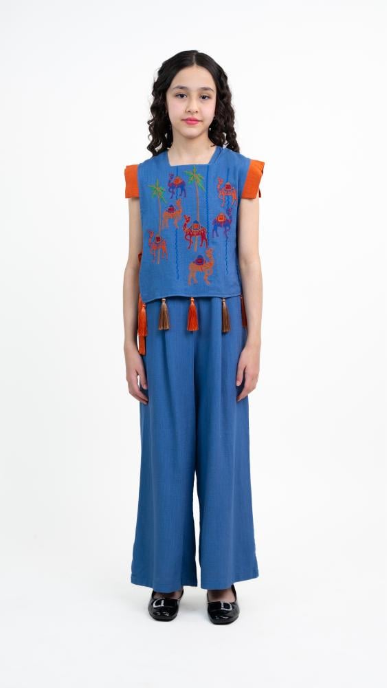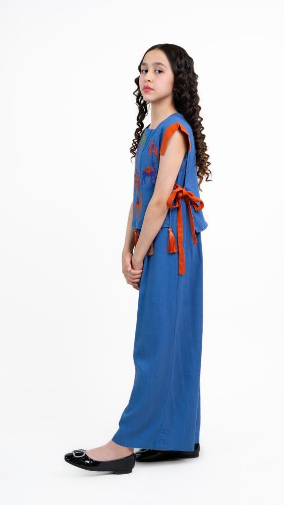 افرول بناتي من قطعتين باللون الأزرق. الجزء العلوي مطرز بجمال ونخيل بألوان زاهية. الأكمام قصيرة بلمسة برتقالية مع أربطة جانبية. الجزء السفلي بنطال واسع مريح.