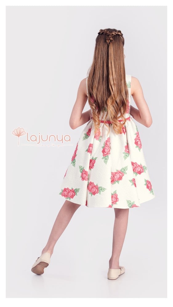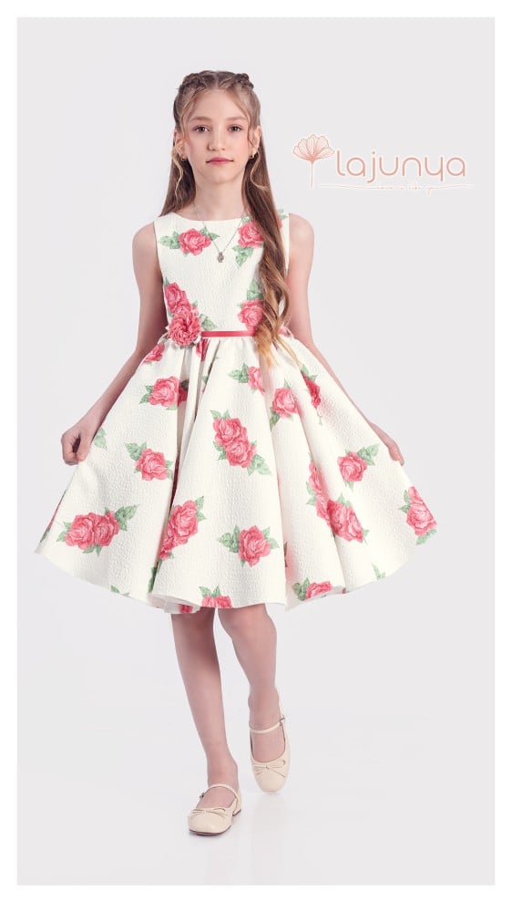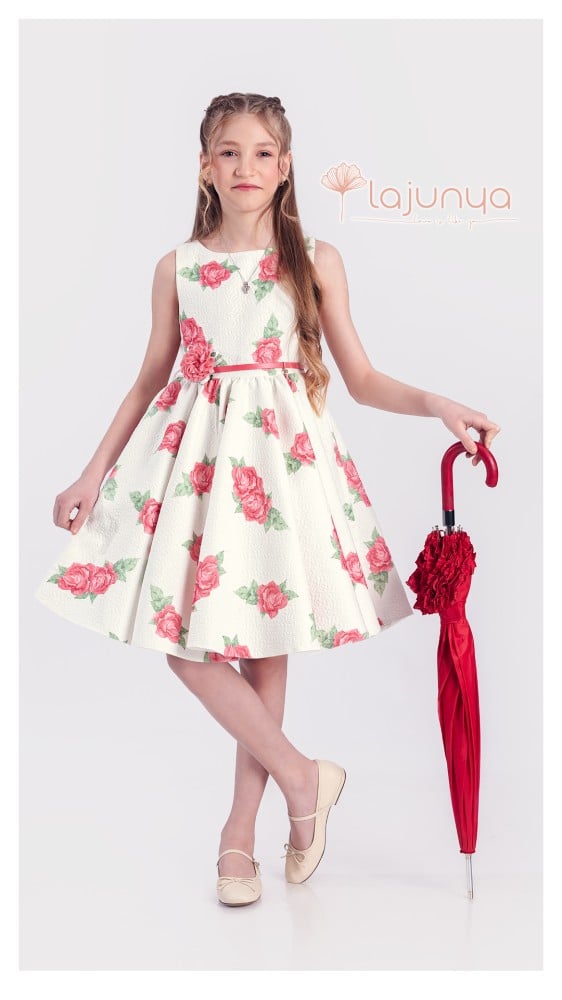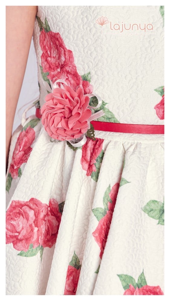 فستان اسباني أبيض مزين بطبعات ورود احمر وأوراق خضراء، بحزام رفيع مع زهرة حمراء عند الخصر.، بتصميم أنيق مناسب للمناسبات.