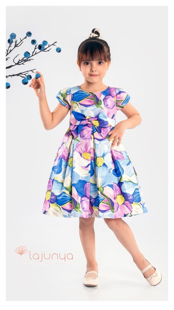 فستان اسباني مع مزيج من الألوان الزاهية نابض بالحياة ، مع أنماط زهور كبيرة. يحتوي الفستان أيضا على أكمام قصيرة ، مع حزام وفيونكة بالخصر.