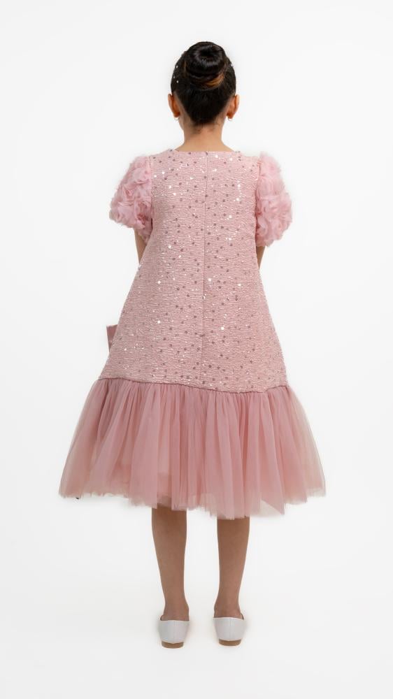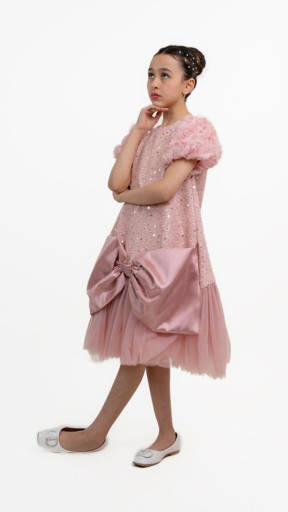 فستان بناتي أنيق بلون وردي هادئ، مزين بتفاصيل براقة. يتميز بأكمام منفوشة مزينة بالورود، مع تنورة تول واسعة وفيونكة كبيرة تضيف لمسة راقية. مثالي للمناسبات الفاخرة.