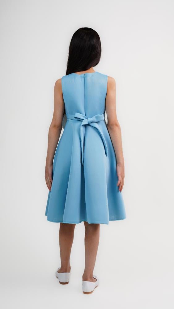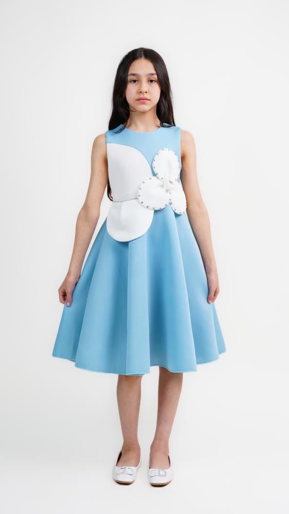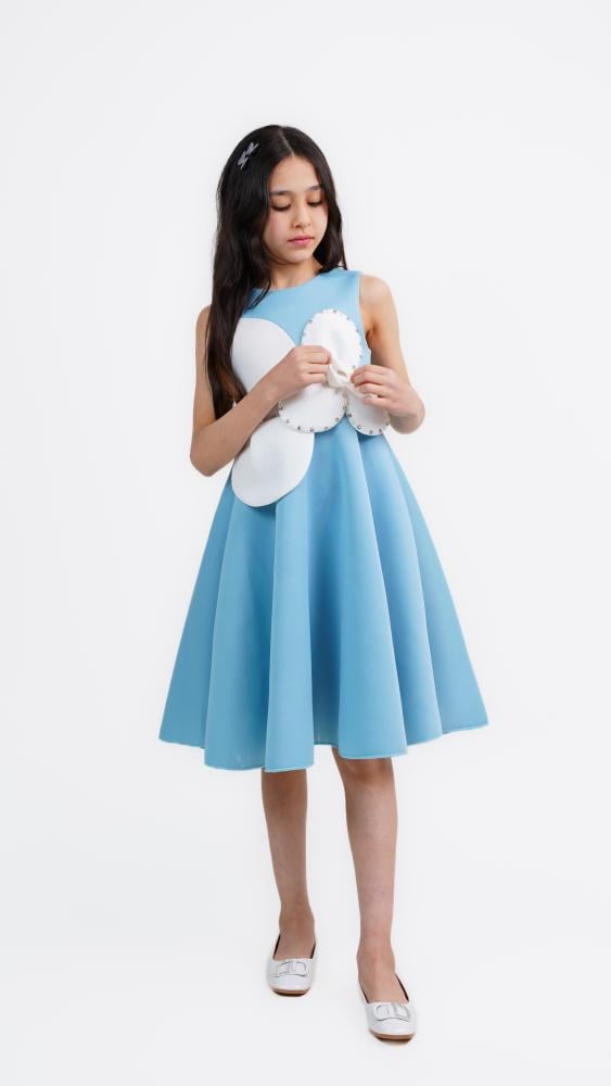 فستان بناتي ساحر بلونه السماوي وقصته الناعمة. يتميز بتصميم واسع وانسيابي يمنح إطلالة راقية، مع لمسة إبداعية من الزخرفة البيضاء الجانبية على شكل زهرة مزينة بحبات براقة. مزيج أنيق بين البساطة والفخامة، مثالي للمناسبات الراقية. 💙✨