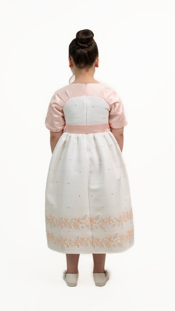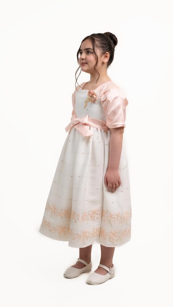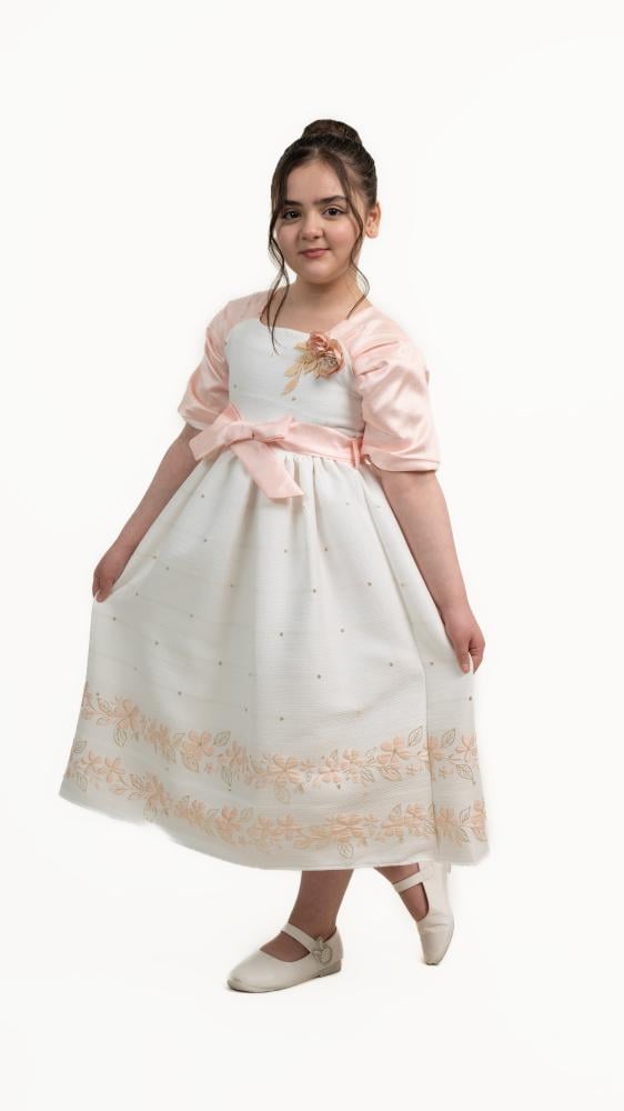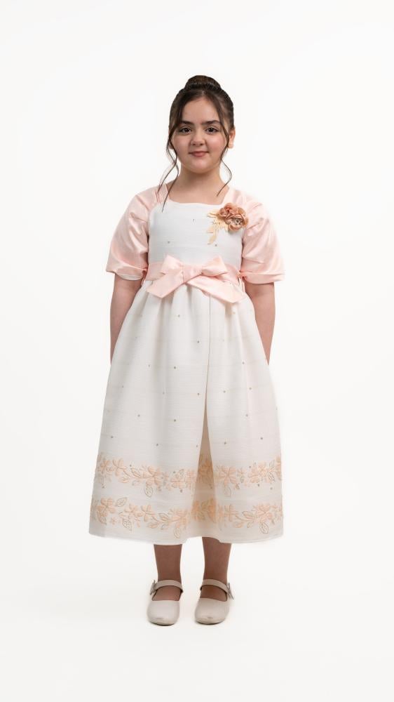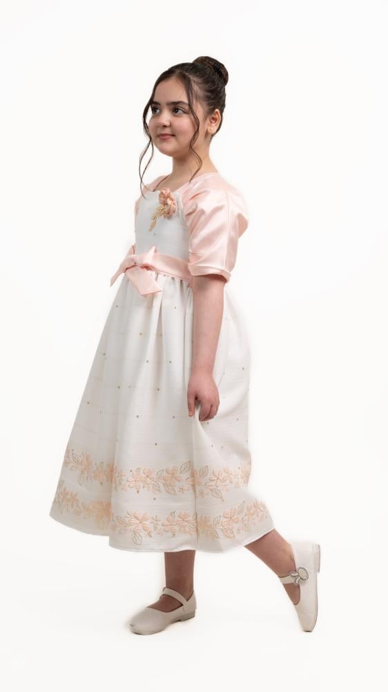 فستان بناتي أنيق بلون أبيض مزين بزهور وردي فاتح، يتميز بأكمام قصيرة وربطة جذابة عند الخصر. يضفي عليه التطريز أسفل التنورة لمسة رقيقة، مما يجعله مثاليًا لإطلالة راقية ومميزة.