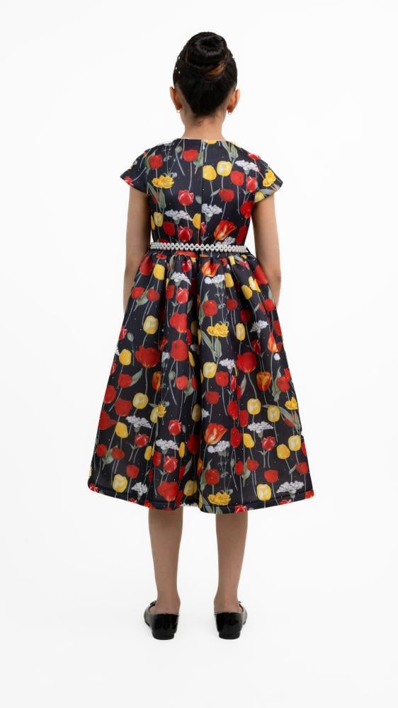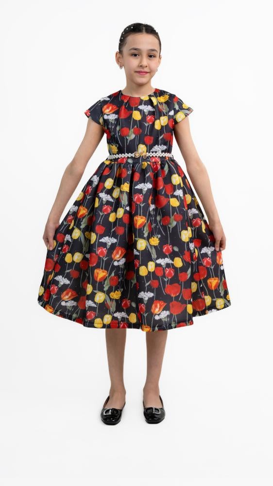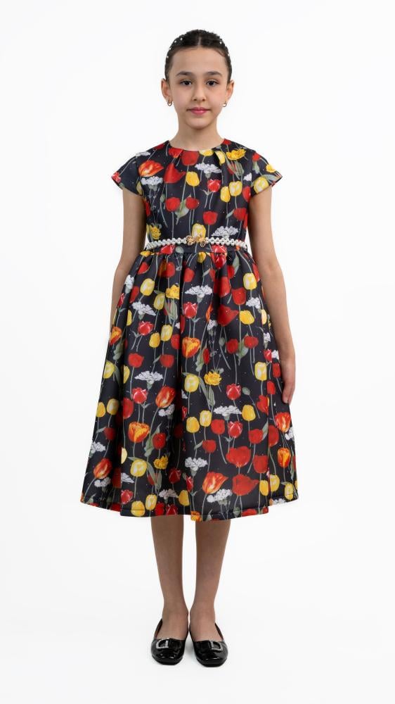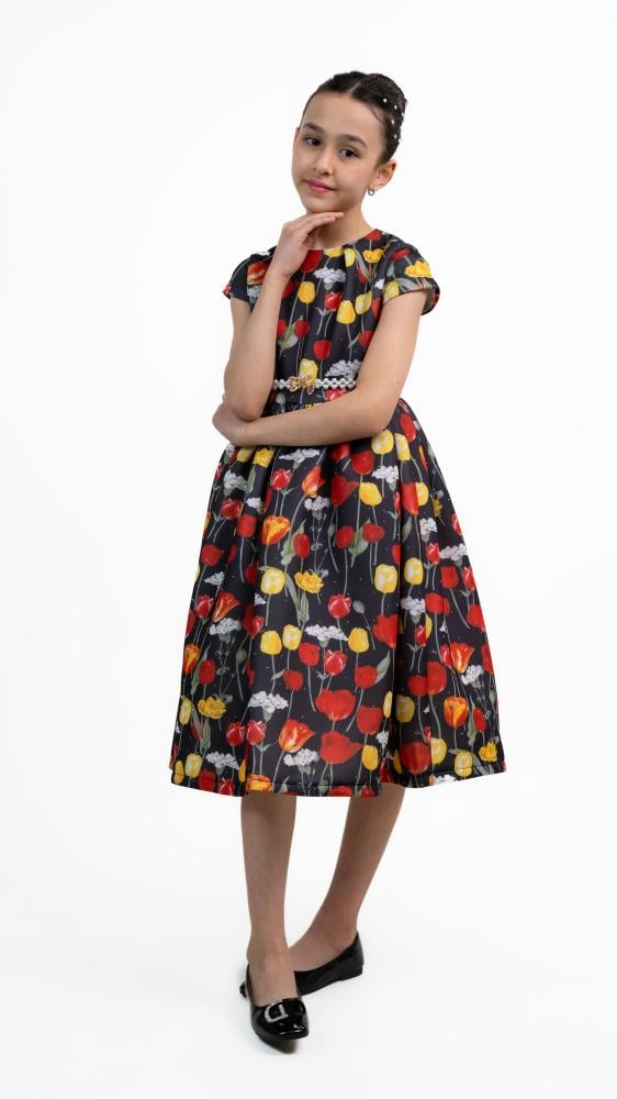 فستان بناتي طبي أسود مزين بنقشة زهور حمراء وصفراء نابضة بالحياة. يتميز بقصة ناعمة وأكمام قصيرة، مع حزام لؤلؤي أنيق مع بروش فراشات ذهبي يضفي لمسة راقية.