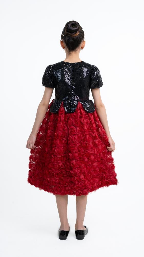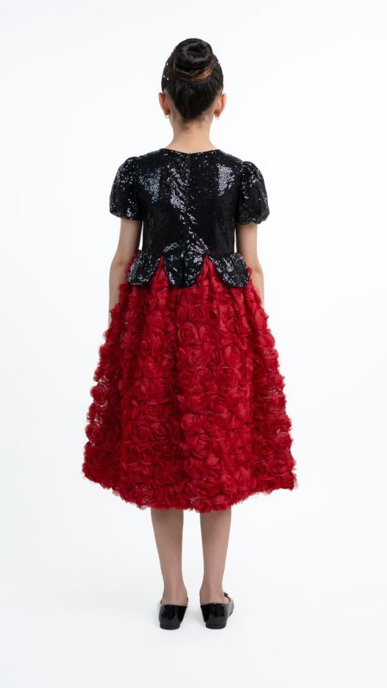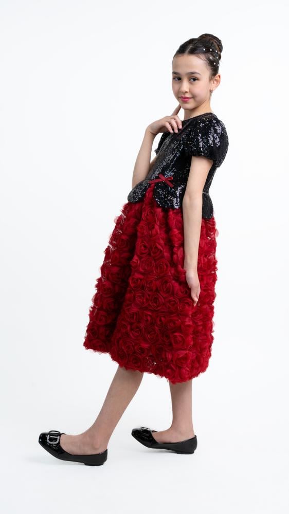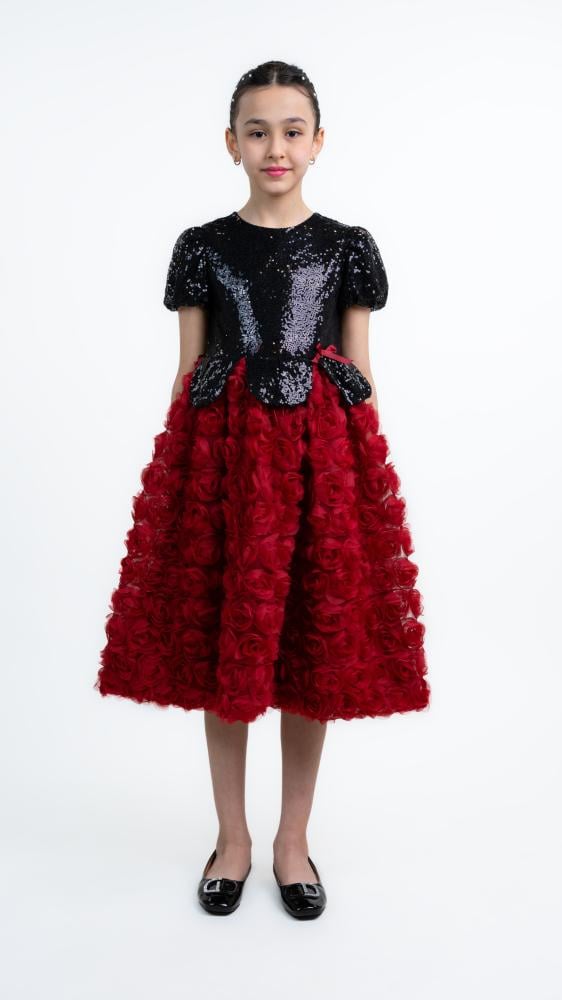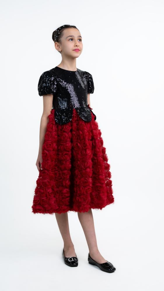 A charming girls dress, featuring a black sequined top and a rich burgundy 3D floral skirt, for a royal and elegant look.