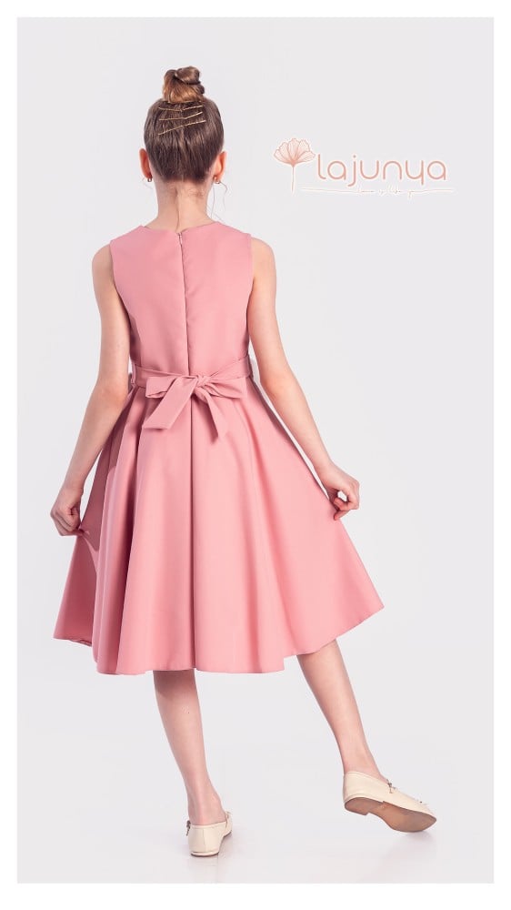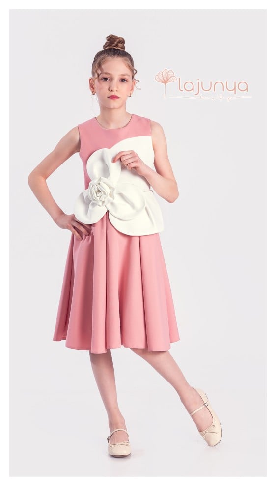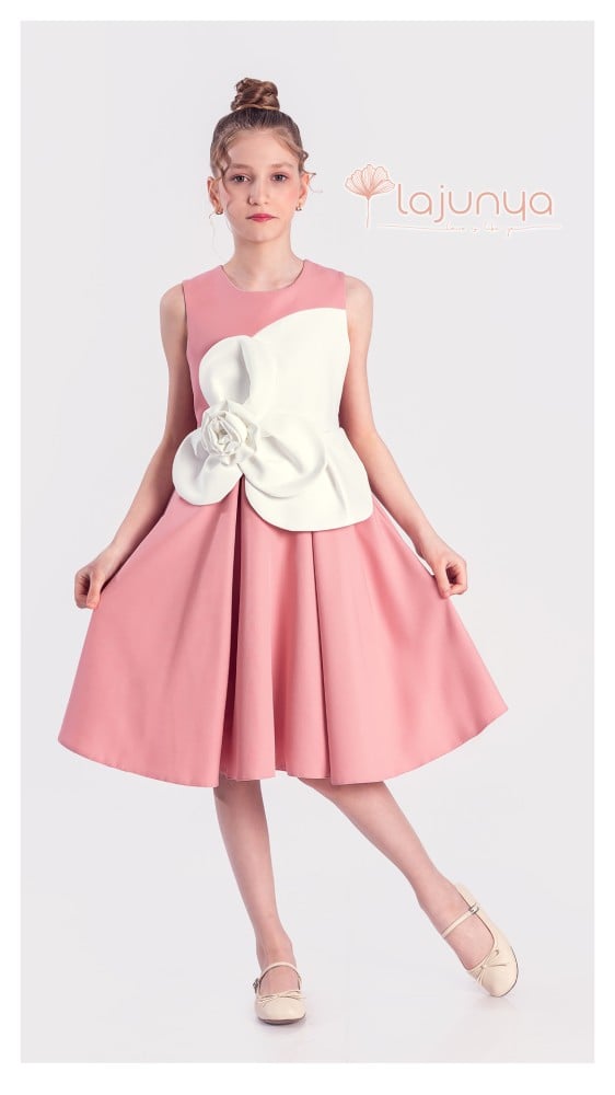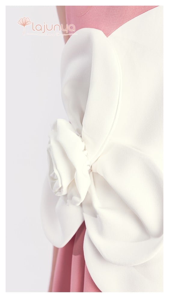 An elegant and attractive Spanish dress in pink, featuring a large white rose on the side. The dress is perfect for formal occasions and weddings.